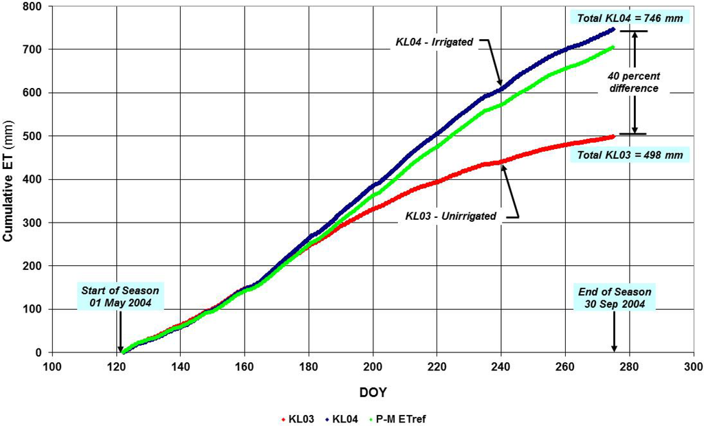 Figure 6 indicates the comparison of the cumulative evapotranspiration for the two sites from the start of the season (DOY 122—01 May) until the end of the irrigation season (DOY 274—30 September). Both sites start with relatively high levels of soil moisture, as well as a high water table, due to significant over-winter precipitation including melting of a relatively deep (on the order of 1-m) snowpack. It can be observed that for the first almost 50 days there is very little difference in the cumulative evapotranspiration between the sites. As shown in Figure 4, during the 20-day period from DOY 130 to 150 there is virtually no difference in cumulative evapotranspiration between the two sites. After about DOY 180 (i.e., end of June) the two sites are on distinctively different paths, with the evaporative flux rate from KL04 (irrigated) significantly higher than that from KL03 (unirrigated). This divergence continues until the end of the irrigation season when there is a measured difference of 248 mm in evapotranspiration between the two sites. This is equivalent to an unbiased difference (dividing by the average cumulative ET of the two sites) of 40 percent between the two sites.