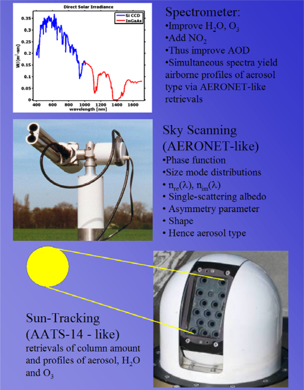 The NASA Ames Sun-photometer-Satellite Group, the Department of Energy (DOE) Pacific Northwest National Laboratory’s (PNNL) Atmospheric Sciences and Global Change Division, and NASA Goddard’s AERONET (AErosol RObotic NETwork) team have collaborated on the development of a new airborne sunphotometry instrument that will provide information on gases and aerosols extending far beyond what can be derived from discrete-channel direct-beam measurements, while preserving or enhancing many of the desirable AATS features (e.g., compactness, versatility, automation, reliability). The enhanced instrument combines the sun-tracking ability of the current 14-Channel NASA Ames AATS-14 with the sky-scanning ability of the ground-based AERONET Sun/sky photometers, while extending both AATS-14 and AERONET capabilities by providing full spectral information from the UV (350 nm) to the SWIR (1,700 nm) as represented in Figure 1. A more detailed view of spectral measurement capability with respect to AATS as well as aerosol extinction and gas constituent absorption features is presented in Figure 2. Strengths of this measurement approach include many more wavelengths (isolated from gas absorption features) that may be used to characterize aerosols and detailed (oversampled) measurements of the absorption features of specific gas constituents.
