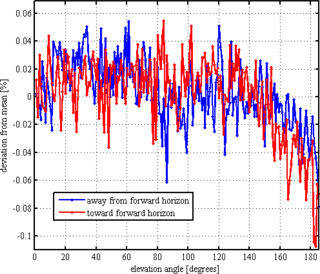 Elevation axis optical path mechanical stability is demonstrated by very low change (ordinate) for both positive and negative rotation over the full range of tracking motion with LED illumination.