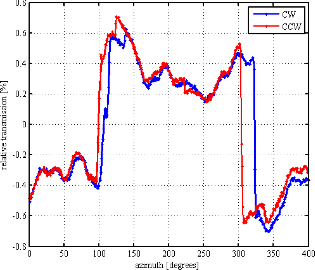 Fiber Optic Rotary Joint (FORJ) transmission as a function of azimuth angle.