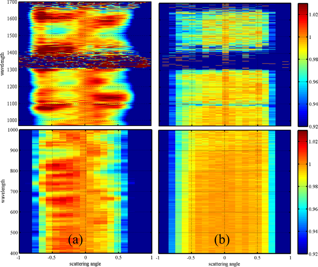 Normalized field of view flatness as a function of wavelength and scattering angle (mis-alignment with solar rays) for (a) surface scattering diffuser, and (b) thinned Spectralon volume diffuser. Color deviation from the orange level corresponding to 1.0 will introduce false radiometric variability as aircraft motion varies the scattering angle.