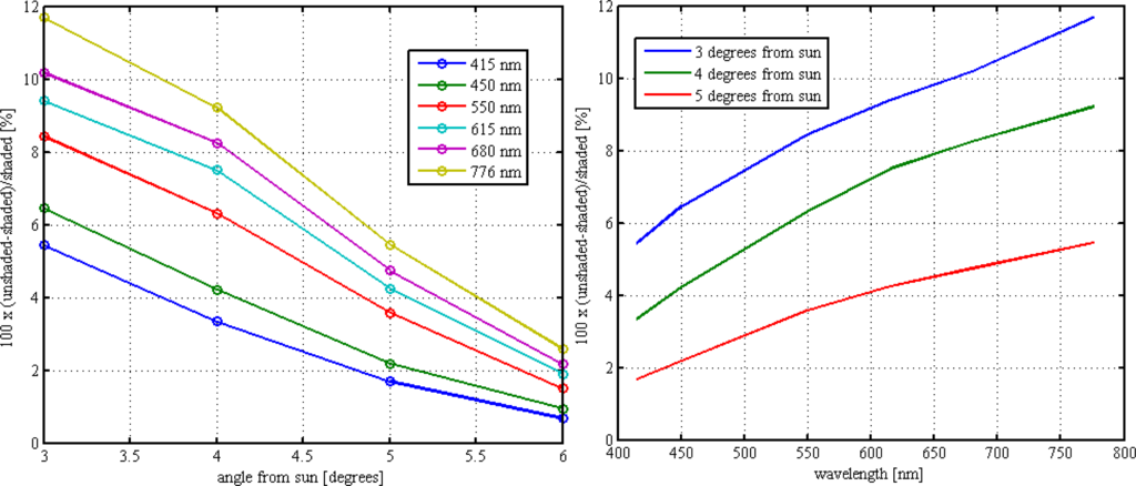 Sky light contamination from direct beam scattering. Left plot shows angular effect at several wavelengths. Right plot shows wavelength dependency for several angles.