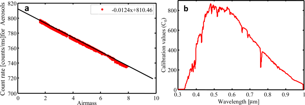 (a) Example Langley plot fit for 500.8 nm, taken during the ground-based calibration campaign in Mauna-Loa, 18 December 2012. Data filtered based on twice the standard deviation from fitted line, intercept value represents the exo-atmospheric calibration value (C0) at the 500.8 nm wavelength, and (b) the corresponding wavelength dependence of C0.