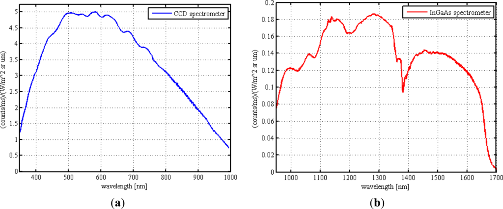 Sky radiance calibrations for the (a) visible and near-infrared (VNIR) and (b) short wave infrared (SWIR) spectrometers.