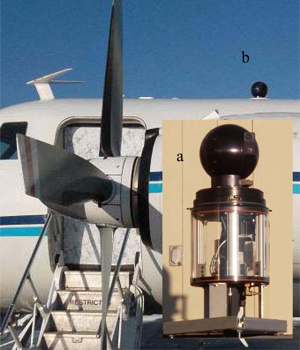 Spectrometer for Sky Scanning Sun-Tracking Atmospheric Research (4STAR) instrument (a) photographed during Langley calibration at Mauna Loa Observatory and (b) mounted in the Department of Energy G-1 aircraft (appearing as black sphere atop fuselage).