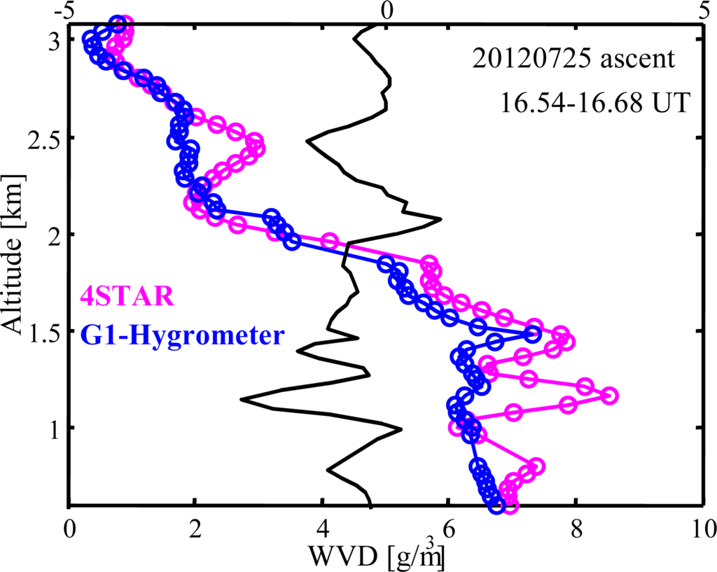 Water vapor density (WVD) retrieved values from Spectrometer for Sky Scanning Sun-Tracking Atmospheric Research (4STAR) (magenta) and the in situ G-1 hygrometer (blue) for a spiral ascent during the 25 July 2012 Two Column Aerosol Project (TCAP) flight, with WVD difference (solid black) on upper axis.