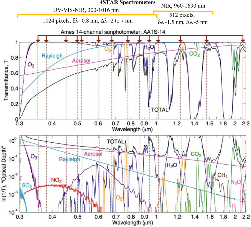 Wavelength ranges and resolutions of the two Spectrometer for Sky Scanning Sun-Tracking Atmospheric Research (4STAR) spectrometers in relation to Ames Airborne Tracking Sunphotometer (AATS)-14 channel wavelengths (vertical lines with arrows) and atmospheric spectra. δλ = spacing of pixel centers; Δλ = slit/diffraction limited full width at half maximum (FWHM). The spectra of transmittance T of the direct solar beam at sea level were calculated using MODTRAN-4.3 with a Midlatitude Summer atmosphere, a rural spring-summer tropospheric aerosol model (Vis = 23 km), and the sun at the zenith. Assumed O3 = 332 DU, NO2 = 0.22 DU.