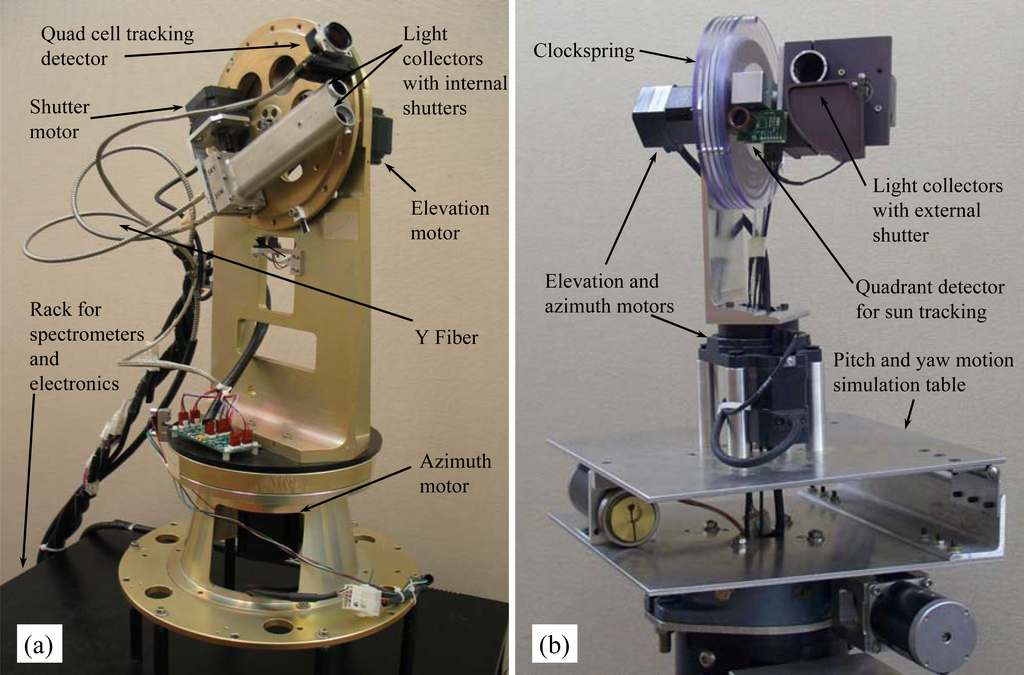 These technical challenges have been addressed through the development and testing of several prototype instruments. An initial ground-based proof-of-concept design was developed to test questions related to fiber optic, Gershun tube, and spectrometer performance. A Zeiss MCS series spectrograph with Hamamatsu CCD detector and Tec5 interface electronics was interfaced to a customized “Y” fiber bundle to permit light collection from either of two Gershun tube collectors optimized for either direct solar beam or scattered sky light collection. (Manufacturer and model information is provided for descriptive purposes only and does not imply recommendation or endorsement by NASA or DOE). An altitude/azimuthal pointing system was designed and fabricated, driven by identical Oriental Motor precision-grade harmonic planetary-geared stepping motors with integrated resolver feedback systems on each axis. National Instruments digitization and motion controller cards were interfaced to a rack-mount industrial PC system with Intel processor, Microsoft Windows XP operating system, and National Instruments LabView graphical data acquisition and control programming software. A second version of the instrument was built in a more flight-like configuration and included a hollow shaft motor on the azimuth axis and a coiled winding or “clockspring” mechanism for the fiber optics and electronics that connected to the light collector and shutter apparatus.