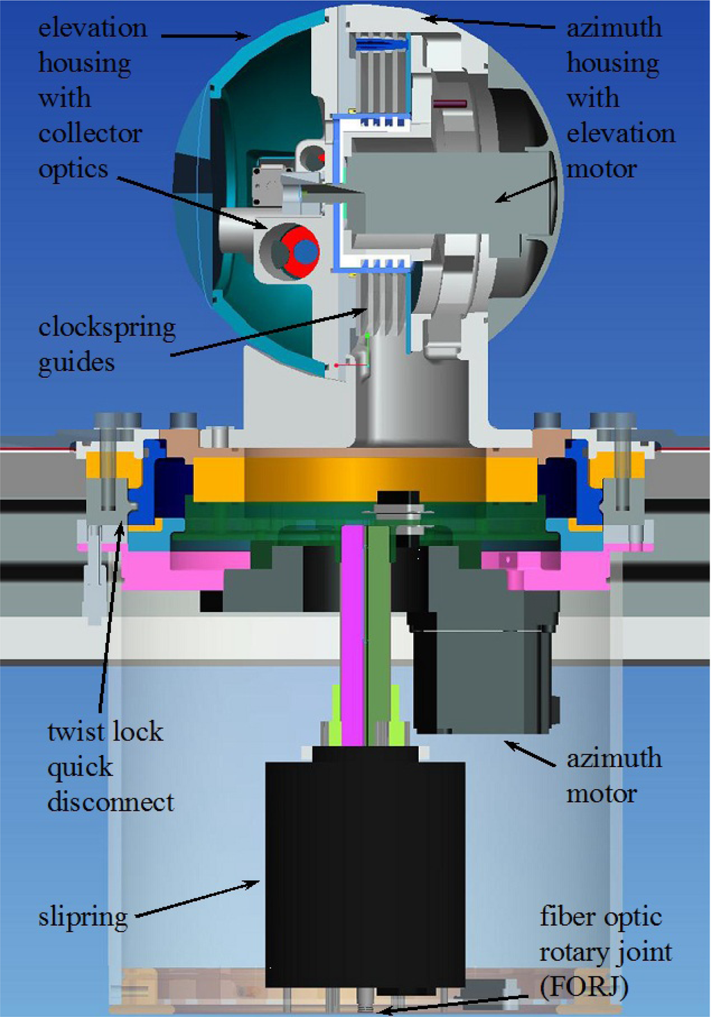 The spiral climb and descent maneuvers typical for vertical profiling requires continuous rotation capability on the azimuth axis. A solid core fiber optic rotary joint (FORJ) design was selected for this axis, recognizing the potential for significant azimutual variability but anticipating deterministic behavior (based on tests performed in the prototype phase) that could be corrected through azimutual calibrations. A stock 48-channel Moog hollow shaft carbon-brush slipring was specified for the electrical conductors. An Oriental Motor helical ring drive rotary actuator was specified to provide a large on-axis region to route these electrical and fiber conductors.