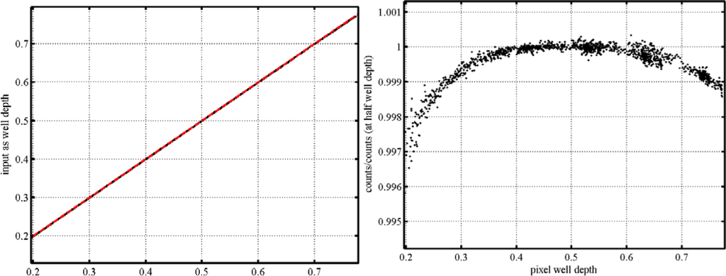 Charge-coupled device (CCD) linearity evaluated from integrating sphere measurements by alternately varying integration time and incident light intensity. The right curve is normalized to 50% of full well.