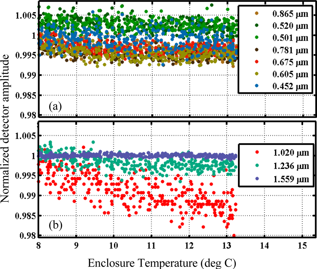 Detector thermal stability at several key wavelengths for the charge-coupled device (CCD) (a) and InGaAs (b) detectors.