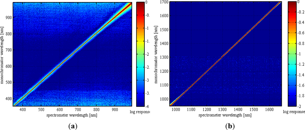 Stray light artifacts for (a) the visible and near-infrared (VNIR) and (b) short wave infrared (SWIR) spectrometers.