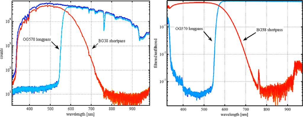 A method to evaluate diffuse stray light (type 2) scattered from, e.g., the grating over the full spectral range involved the use of high pass and low pass cutoff filters (optical density > 4) to examine leakage onto the detector for the wavelength range that was known to be blocked by the filter. This leakage can be more problematic for the UV or IR regions of the spectrum where the solar illumination is weak and can be overwhelmed by even very slight scattering from the peak regions of the spectrum. This test indicates that stray light effects are less than 0.1% for wavelengths greater than 420 nm (Figure 9).