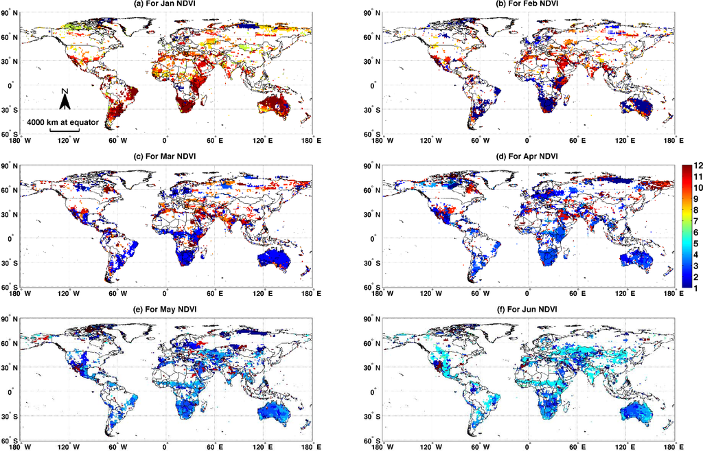 Month of which precipitation is most strongly correlated (positively, N = 29, 1982 to 2010) with GIMMS NDVI of a particular month. For each of the 12 months (a–l), NDVI is generally most dependent on precipitation 1 month ahead (Spatial resolution: 1°).