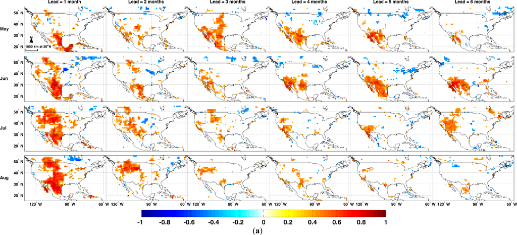Regional maps of correlation coefficients (p < 0.05) between month-specific GIMMS NDVI and GPCP precipitation anomalies with varying leads (N = 29, 1982–2010): (a) North America and (b) Australia (Spatial resolution: 1°).