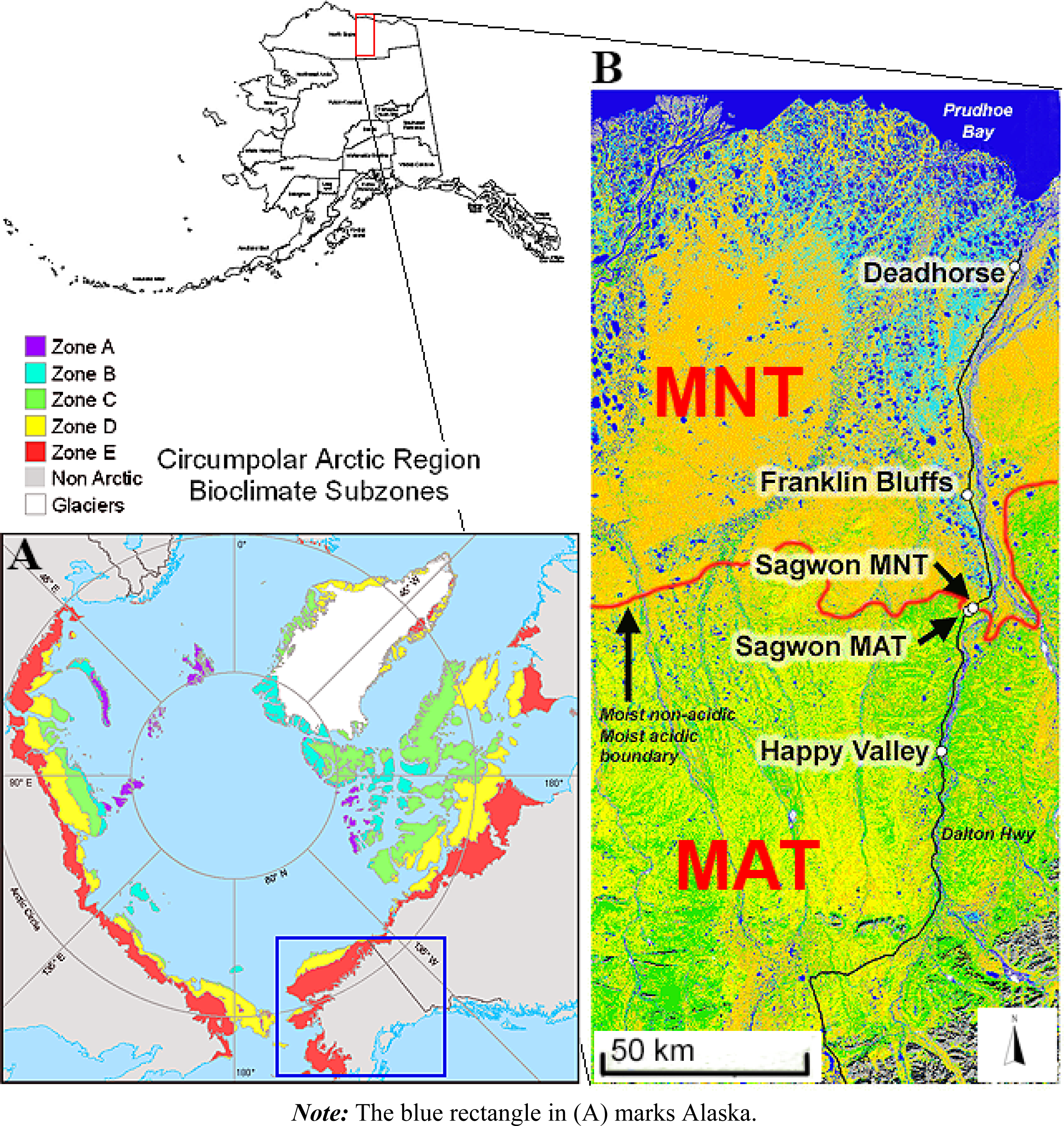 An important soil pH boundary occurs at Sagwon [46]. Two test sites (Sagwon-MNT and Sagwon-MAT) were established at the Sagwon Hills study location to capture this variation in the patterning between Subzones D and E (Figures 2 and 3). This boundary separates the predominantly moist acidic tundra (MAT) south of the boundary from the predominantly moist non-acidic tundra (MNT) to the north. The boundary is close to but not coincident with a physiographic boundary separating the Arctic Foothills to the south from the Arctic Coastal Plain to the north [47]. The MAT plant community is Sphagno-Eriophoretum vaginati [48] (also called “acidic tussock tundra” or “tussock-sedge, dwarf-shrub, moss tundra” [35]) and corresponds to the zonal plant community of bioclimate subzone E in northern Alaska. It occurs widely across the foothills of northern Alaska on old upland surfaces not glaciated during the Last Glacial Maximum. The vegetation is composed of a mixture of tussock sedges, deciduous dwarf shrubs, evergreen dwarf shrubs, a few forbs, mosses, and lichens. The MNT plant community is Dryado integrifoliae-Caricetum bigelowii [35] (also called “nontussock sedge, dwarf-shrub, moss tundra” [35]) and corresponds to the zonal plant community of bioclimate subzone D in northern Alaska. It occurs on circumneutral to basic soils in association with silty loess that is blown from the major rivers in the eastern part of the Arctic Coastal Plain. The dominant plants in MNT are sedges, prostrate and hemi-prostrate evergreen dwarf shrubs, prostrate dwarf deciduous shrubs, scattered erect dwarf deciduous shrubs, several forbs, mosses, and lichens. An important component of the MNT is the abundant nonsorted circles (frost boils), which are small patterned ground features caused by soil frost heave and covering large parts of most MNT surfaces [37,49].