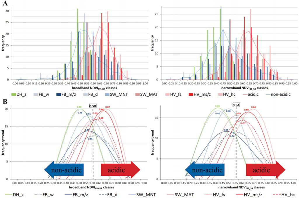 (A) Histogram of the probability distribution of the broadband NDVIAVHRR (left) and narrowband NDVI47_59 (right) values of each quadrat, and (B) polynomial trends of the broadband NDVIAVHRR (left) and narrowband NDVI47_59 (right) distributions with a separation value (black dotted line) for acidic and non-acidic tundra.Note: Naming and coloring of the reflectance spectra follow the concept shown in Figure 2.