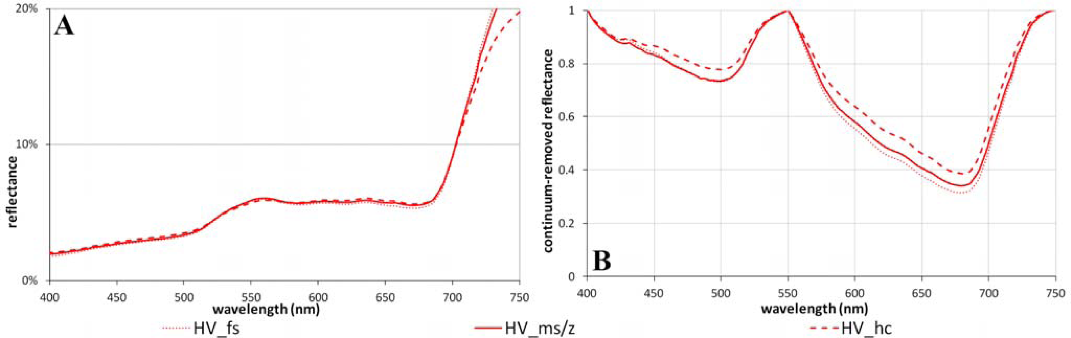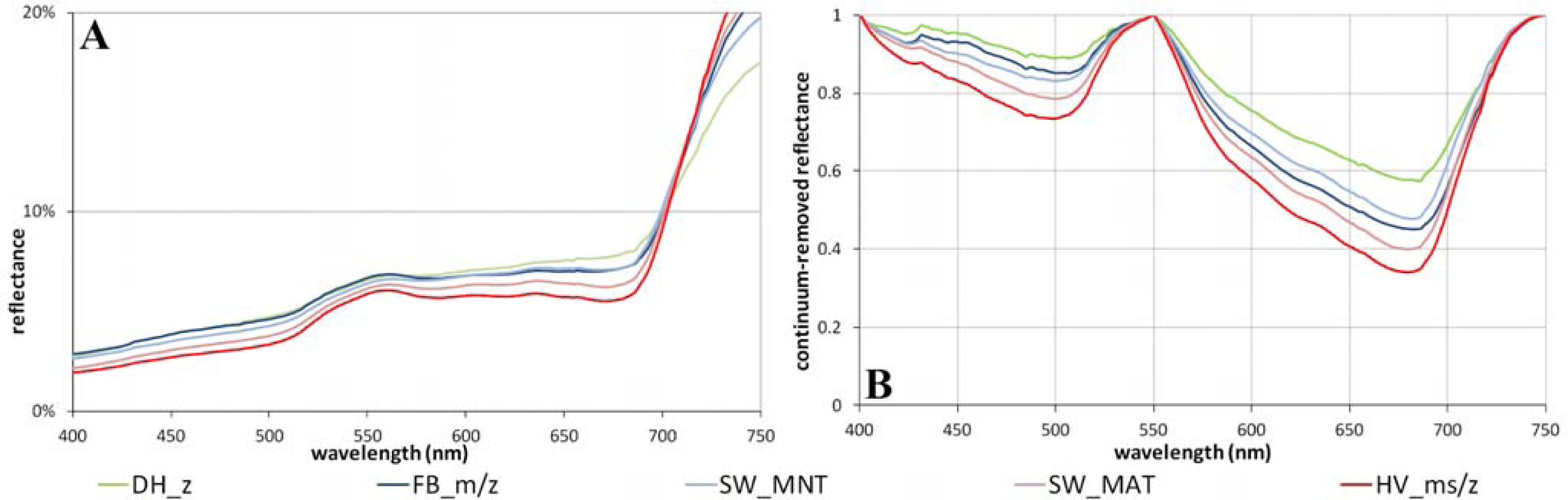 The spectral metrics derived from the continuum removal analysis also exhibit the same trend of increasing absorption in the blue and red wavelength regions along the climate gradient towards the south (Figure 7B). The area of the blue absorption feature increases from 8.7 at DH_z to 23.0 at HV_ms/z, and the maximum band depth at around 500 nm increases from 0.11 at DH_z to 0.27 at HV_ms/z. For the red absorption feature the area increases from 48.4 at DH_z to 77.5 at HV_ms/z, and the maximum band depth at around 680 nm increases from 0.43 at DH_z to 0.66 at HV_ms/z.
