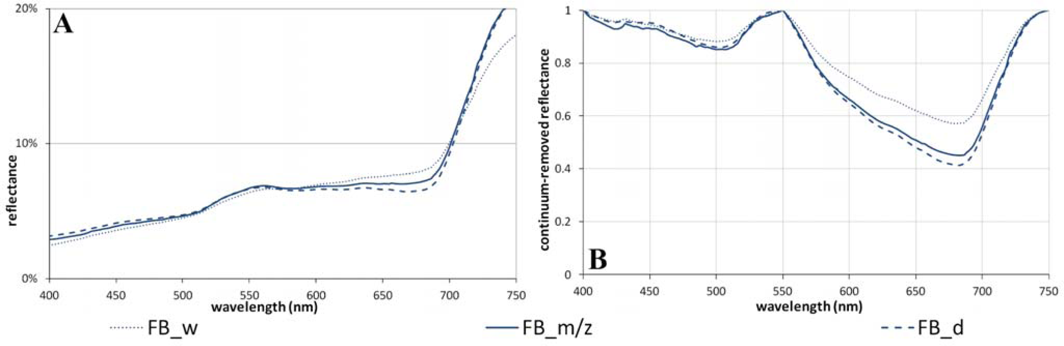 All three sites have nearly the same reflectance values in the 300 nm wide VIS band (5.7% to 5.8%) (Table 3). The results of the relative absorption depth analysis show a minor separation of the sites along the soil moisture gradient in the blue region and a more distinct separation in the red region. The relative absorption depth in the blue spectrum increases from 0.37 at FB_d, 0.41 at FB_m/z, to 0.44 at FB_w. In the red wavelength region this trend is reversed, so the absorption depth decreases from 1.07 at FB_d, 0.98 at FB_m/z, to 0.72 at FB_w. In addition, the continuum removal technique shows no clear site separation along the gradient in the blue (400–550 nm) region (Figure 12B). The area of the blue continuum removed absorption feature is 9.9 at FB_d, 11.9 at FB_m/z and 9.2 at FB_w, and the maximum band depth at 500 nm is 0.14 for the dry, 0.15 for the mesic and 0.12 for the wet site. A better separation along the gradient appears for the red absorption feature from 550–750 nm. The area of the absorption feature increases from 49.4 at FB_w, 64.5 at FB_m/z to 68.2 at FB_d. Likewise, the maximum continuum removed band depths at 680 nm increase from 0.43 for the wet site, 0.55 for the mesic, to 0.59 for the dry site.