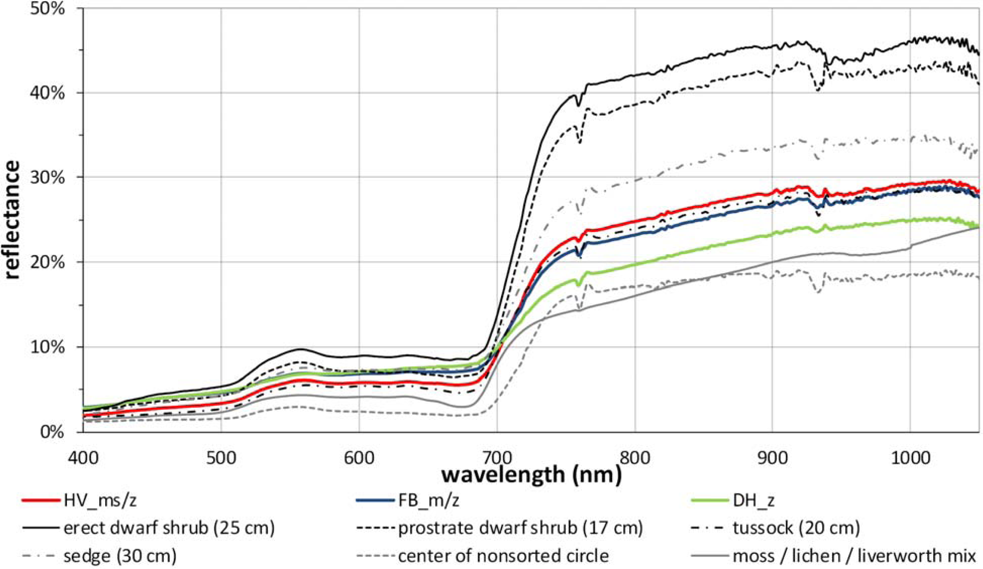 Figure 13 shows reflectance targets of tundra vegetation communities and of endmember targets (plant functional types) related to Arctic vegetation of subzones D and E. Two reflectance spectra have been measured over biological soil crusts: a reflectance spectrum of “moss/lichen/liverwort mix” from Clark et al. [83] and from nonsorted circles. Both reflectance spectra show considerable absorption in orange to red wavelengths with the development of a red-edge in contrast to reflectance spectra of barren soil surfaces without the development of a red-edge structure. Reflectance spectra of shrubs show high NIR backscatter with a planar NIR reflectance plateau with only minor or no slope between the beginning and end of the NIR reflectance plateau. This can be seen in the reflectance spectra of erect dwarf shrubs of 25 cm height and prostrate dwarf shrubs of 17 cm height (Figure 13). Both reflectance targets are characterized by dense and planophil leave structures. In contrast, reflectance spectra from sedges (30 cm) and tussock (20 cm) show NIR reflectance plateaus with stronger slopes between the beginning and end of the NIR reflectance plateau that also characterizes all the reflectance spectra of the tundra sites (Table 3, delta value between 1,020 nm and 750 nm). Reflectance targets with sedges and tussock show erectophile vegetation structure as well as dead plant material. They are therefore producing less multiple backscattering in the NIR. The structural dependence on planophil and erectophil vegetation structures on the NIR reflectance has been described by Thenkabail et al. [78] for crops.
