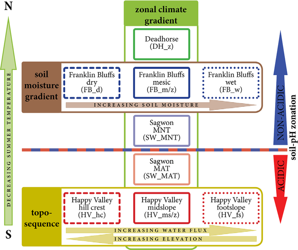 The nine study sites in relation to environmental gradients and zones concept (zonal climate, soil pH, soil moisture, and toposequence/hillslope) along the Low Arctic part of the NAAT.Note: Border color and texture are specific for each study site and will be used in all figures in order to distinguish between the sites.