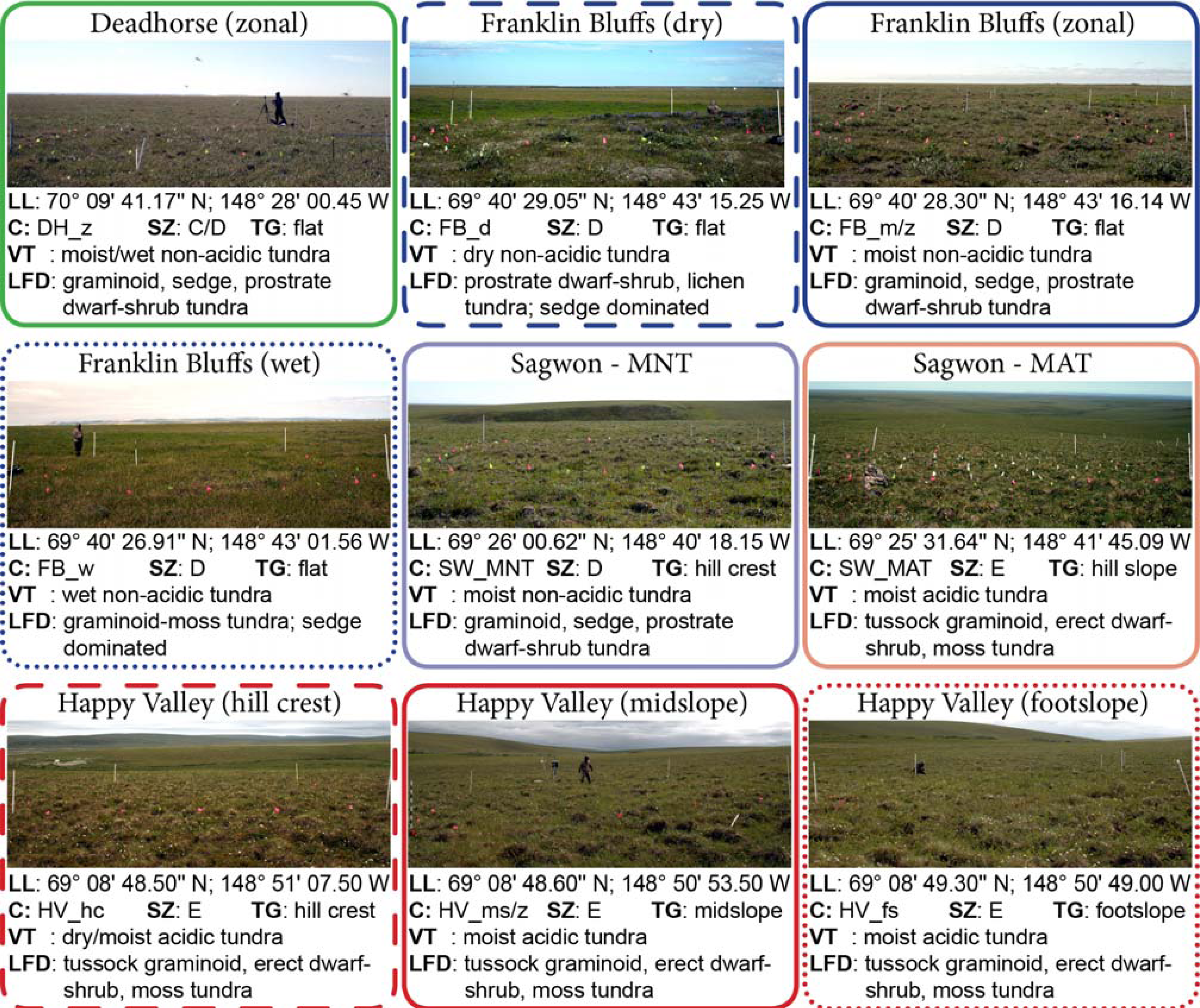 The three Franklin Bluffs study sites are separated into dry (36 Vol% soil moisture), mesic (zonal) (48 Vol%) and wet (74 Vol%) moisture regimes. This local soil moisture gradient is also noticeable in the averaged vegetation heights (Table 2). Whereas the dry site (FB_d) has a mean vegetation height of 14 cm, this increases to 15 cm at the mesic site (FB_m/z) and to 30 cm at the wet site (FB_w). The overall percentage cover of vegetation (non-lichen) ranges from 90 to 95% across the sites due to the effect of nonsorted circles, which have centers that are mainly covered by soil crusts. There is also a change in the vegetation composition and structure. At the wet site, sedges forming the second height stratum become more dominant and cover 80% of the whole area with a maximum height of 40 cm. The mesic site has a percentage cover of the second stratum of 82%, and the dry site of 40%. At both sites sedges and shrubs are the main species in this stratum. Shrubs form the third vertical stratum at the mesic site with 5% cover and a maximum height of 40 cm, whereas at the dry site the cover increases to 20%, but the height decreases to 35 cm. An increase of standing dead material can be seen from the dry to the wet site.