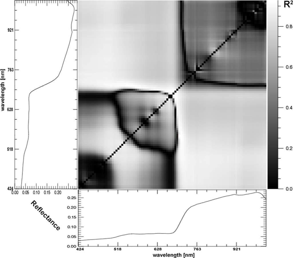 In preparation for the EnMAP hyperspectral space mission we resampled the field spectroscopy data to EnMAP sensor bands using the spectral response curves of the sensor. In order to assess all possible EnMAP band combinations, we calculated the HTBVI according to Equation (1) [31,34,71]