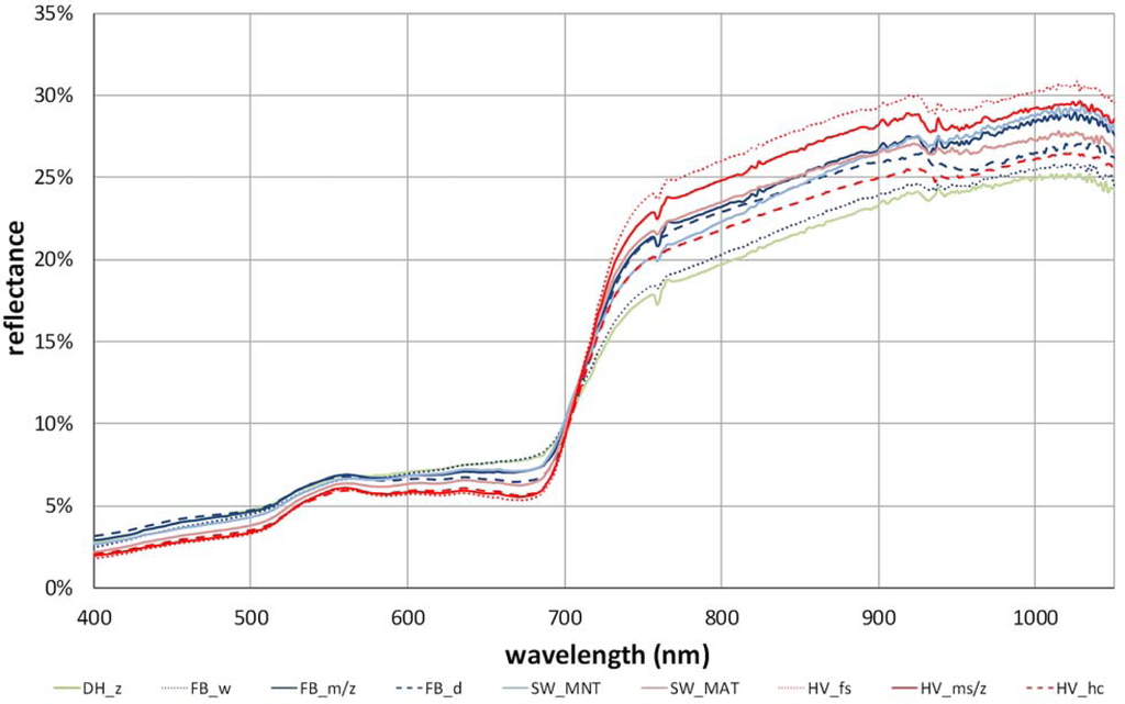 Each reflectance spectrum along the temperature gradient shows a similar shape with a steady NIR increase, and the further south the geographic location of the site, the higher is the NIR reflectance (Figure 5). None of the reflectance spectra has a well-developed NIR reflectance plateau. This trend is also noticeable in the 350 nm wide NIR band reflectance and the maximum reflectance at 750 nm and 1,020 nm (Table 3). The reflectance of the 350 nm wide NIR band increase from 21.4% at DH_z to 25.8% at HV_ms/z, and the maximum reflectance at 1,020 nm increases from 25.2% at DH_z to 29.5% at HV_ms/z.