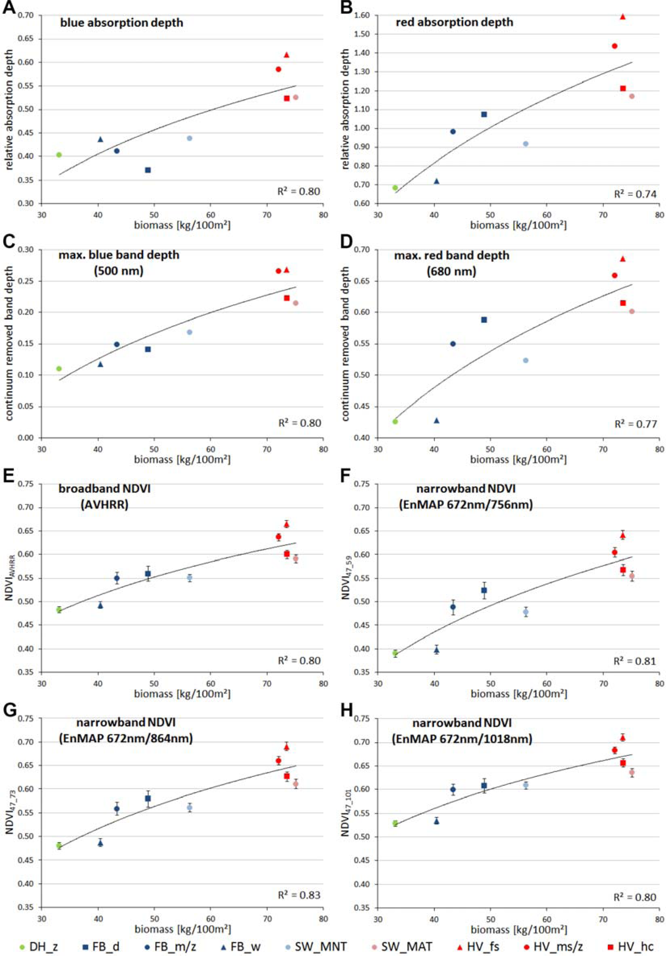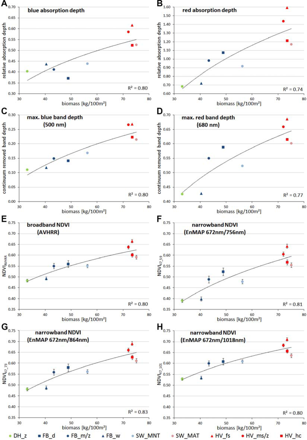 Spectral metrics of the study sites as a function of biomass. (A) Relative blue absorption depth vs. biomass; (B) Relative red absorption depth vs. biomass; (C) Continuum removed maximum blue band depth vs. biomass; (D) Continuum removed maximum red band depth vs. biomass. Correlation between (E) broadband NDVI with biomass compared with three (F–H) narrowband NDVIs with biomass.