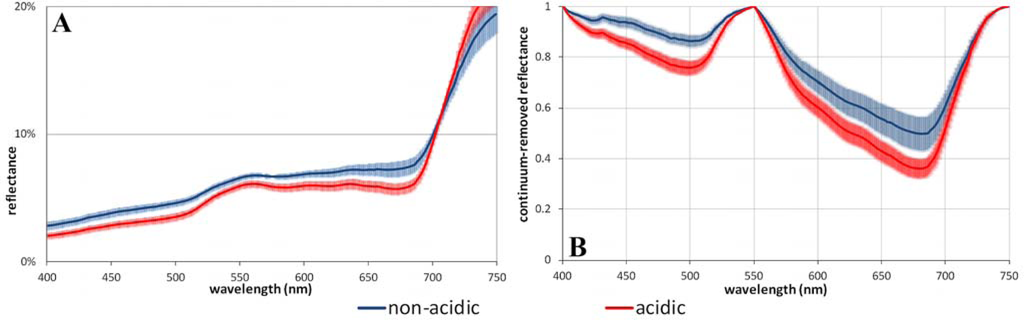 Spectral characteristics of the plant communities on acidic and non-acidic soils (soil pH zones). Comparison of (A) the averaged reflectance spectra in the visible (400–700 nm), and (B) the continuum-removed absorption features in the blue (400–550 nm) and red (550–750 nm) wavelength regions.Note: All spectra of the sites belonging to acidic or non-acidic soils have been averaged and are shown with ±1 standard derivation.