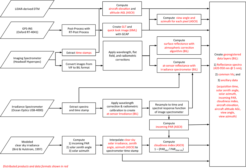 Ancillary data products include valuable information for each pixel of the image cube, including: acquisition time, solar zenith angle, solar azimuth, incoming PAR, cloudiness index [21], aircraft elevation, aircraft altitude AGL, view angle and view azimuth. These time-space variables are computed from the LiDAR-derived DTM and a clear sky irradiance model [29]. The products will help end users create additional higher-order products (e.g., solar and view angles are needed for computing bidirectional corrected reflectance; terrain and canopy heights are needed for orthorectification) and facilitate scientific data analysis (e.g., cloudiness and solar illumination conditions affect canopy photosynthesis).