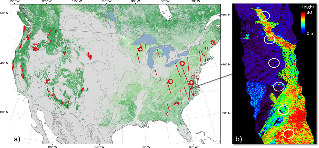 G-LiHT coverage (show as red lines) as of September 2012 (a). Long transects are coincident G-LiHT data along ICESat GLAS LiDAR tracks, enlarged in (b), which capture fine scale heterogeneity in large, space-base LiDAR footprints (65 m diameter). Other collections in the USA include Forest Inventory and Analysis (FIA) plots and intensive study sites. The green color in (a) represents percent forest cover [35,36]; dark gray lines indicate country borders, and light gray lines delineate terrestrial ecoregions [37].