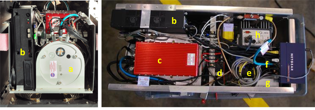 End and top views of G-LiHT instrument package, showing the (a) scanning LiDAR; (b) data acquisition computer; (c) GPS-INS; (d) irradiance spectrometer; (e) imaging spectrometer; (f) thermal infrared camera; (g) GPS time server; and (h) profiling LiDAR.
