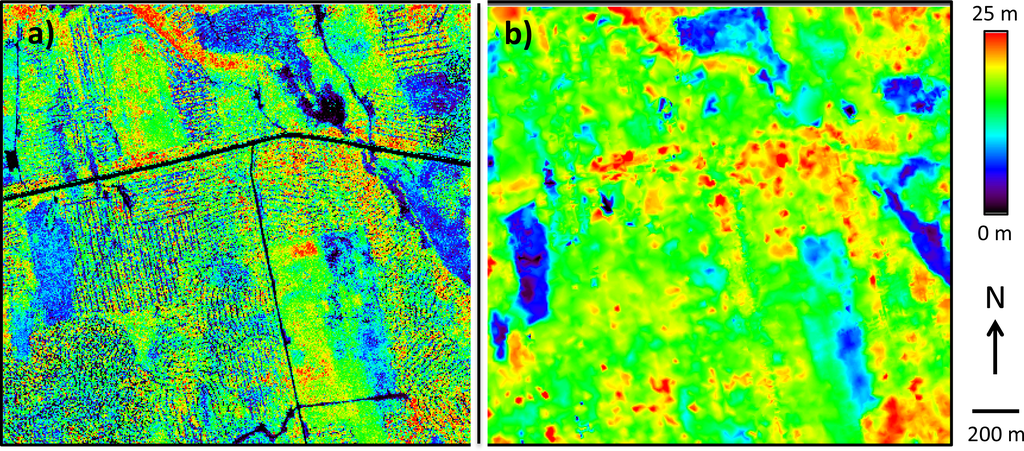 (a) Digital Terrain Model (DTM) and (b) Canopy Height Model (CHM) products for a 9 × 14 km study area in the Chequamegon-Nicollet National Forest, Park Falls District, WI, USA (5 June 2012; 45.9447°N 90.2519°W). The DTM shows lakes, rivers and landforms formed by glacial scouring and transported deposits during the Wisconsin glaciation, and variations in the CHM reflect a diversity of ecosystems and land use management practices.