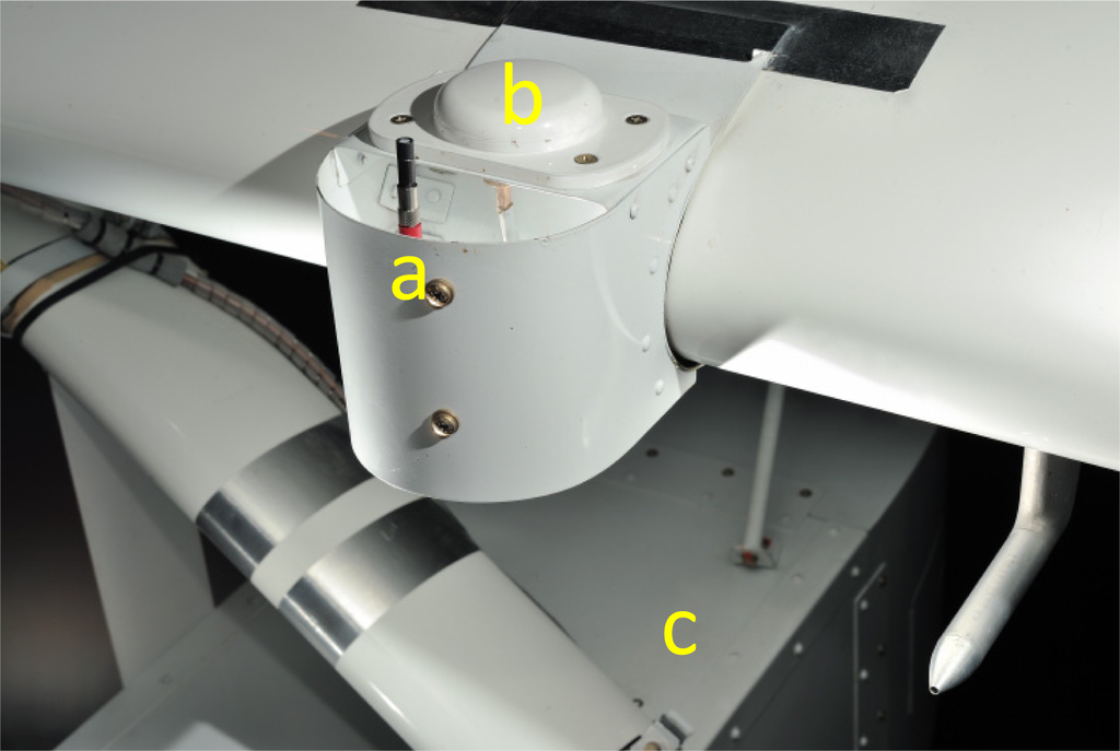 Irradiance cosine diffuser (a) and GPS antenna (b) attached to the leading edge of a Cessna 206 wing with a custom-mounting device. The wing-mounted pod containing the G-LiHT instrument package is seen below (c).