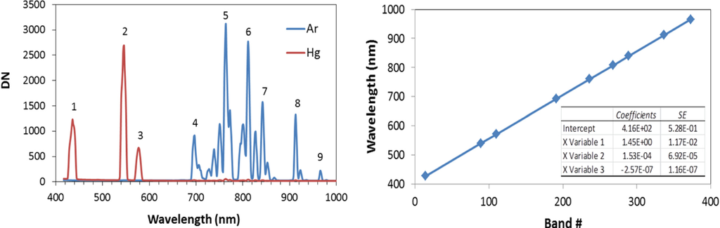 (a) Hg and Ar lamp emission lines as viewed through G-LiHT’s imaging spectrometer; (b) relationship between band number and band center wavelength using Gaussian iterative curve fitting.