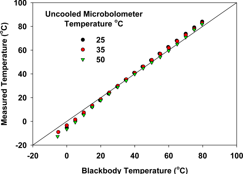 G-LiHT’s thermal imaging camera has factory radiometric calibration for surface temperatures between −20 °C and 120 °C, with a Noise Equivalent Temperature Difference (NETD) >50 mK. This wide dynamic range allows for airborne operations of the thermal image over a diverse range of surface temperatures. Thermal calibration stability as a function of a microbolometer operating temperature range of 25 °C to 50 °C was verified against a GSFC Calibration Facilities blackbody for stable operation over the target temperature range of −5 °C to 85 °C (Figure 8).