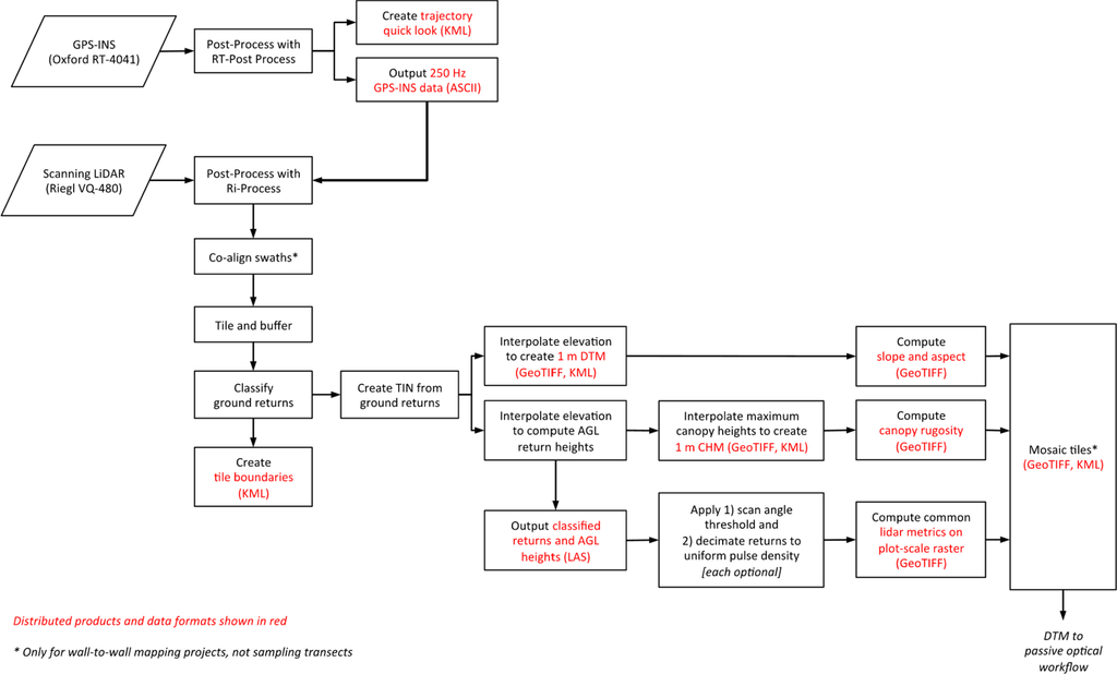 An automated data processing system is key to releasing standardized products in a timely manner. Data processing begins with the GPS-INS and scanning LiDAR data, since some of the products are used in processing the imaging spectrometer and thermal data. Workflows for the scanning LiDAR and spectrometer data have been developed as illustrated in Figures 9 and 10. Manual pre-processing of L0 data with vendor supplied software is the first step in the workflows, followed by automated data processing algorithms that have been custom coded in the IDL-ENVI (Interactive Data Language and Environment for Visualizing Images) scientific programing language (Exelis Visual Information Solutions, Boulder, CO, USA). The following sections describe the specific data processing steps.