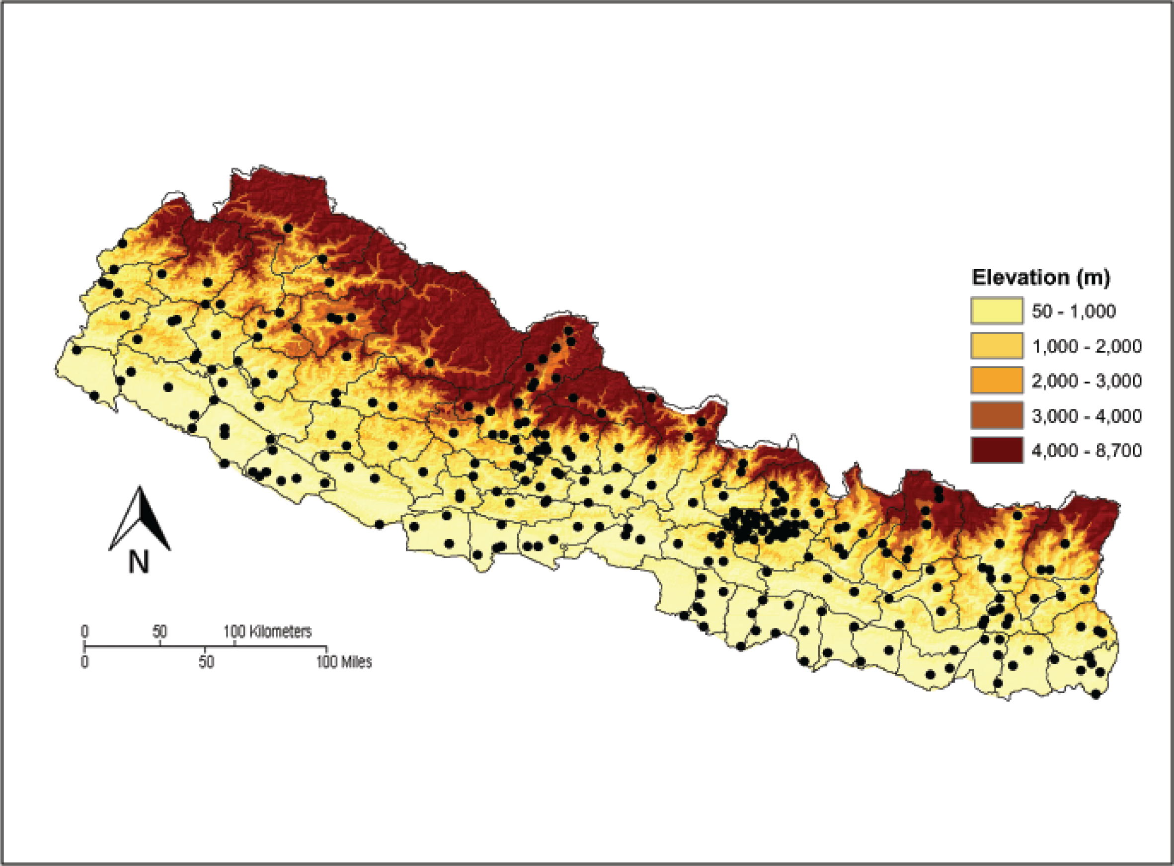 Topography and district boundaries of Nepal. Circles show the locations of stations with precipitation data (from the Department of Hydrology and Meteorology (DHM), People and Resource Dynamics Project (PARDYP) or Stations at High Altitude for Research on the Environment (SHARE)) used in this study.