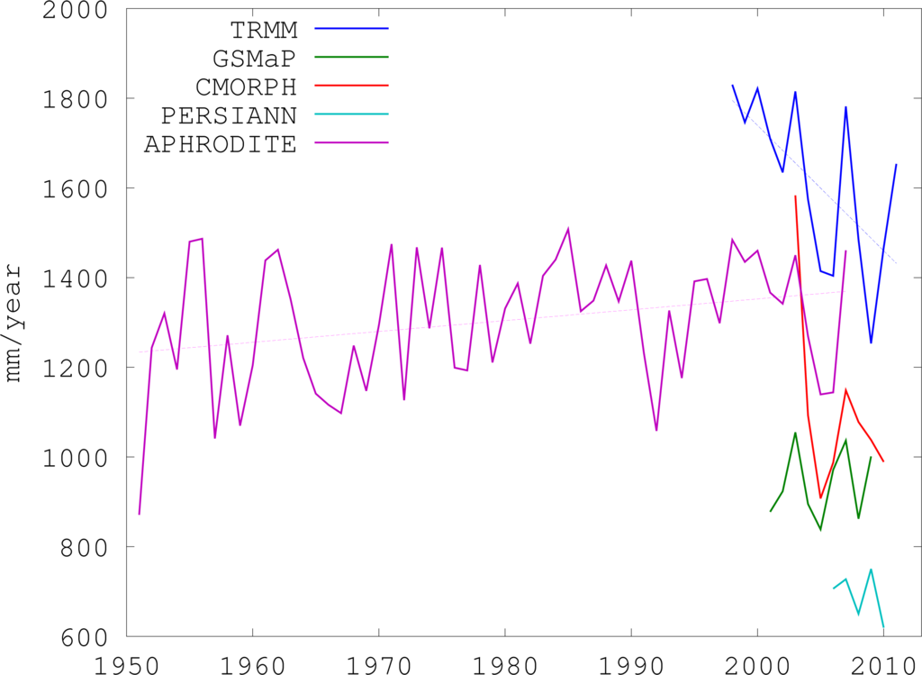 Mean annual precipitation over Nepal from TRMM (1998–2011), GSMaP (2001–2009), CMORPH (2003–2010), PERSIANN (2006–2010) and APHRODITE (1951–2007). Least-squares linear trend fits for the TRMM and APHRODITE products, which have the longest available time series, are also shown (thin dashed lines).