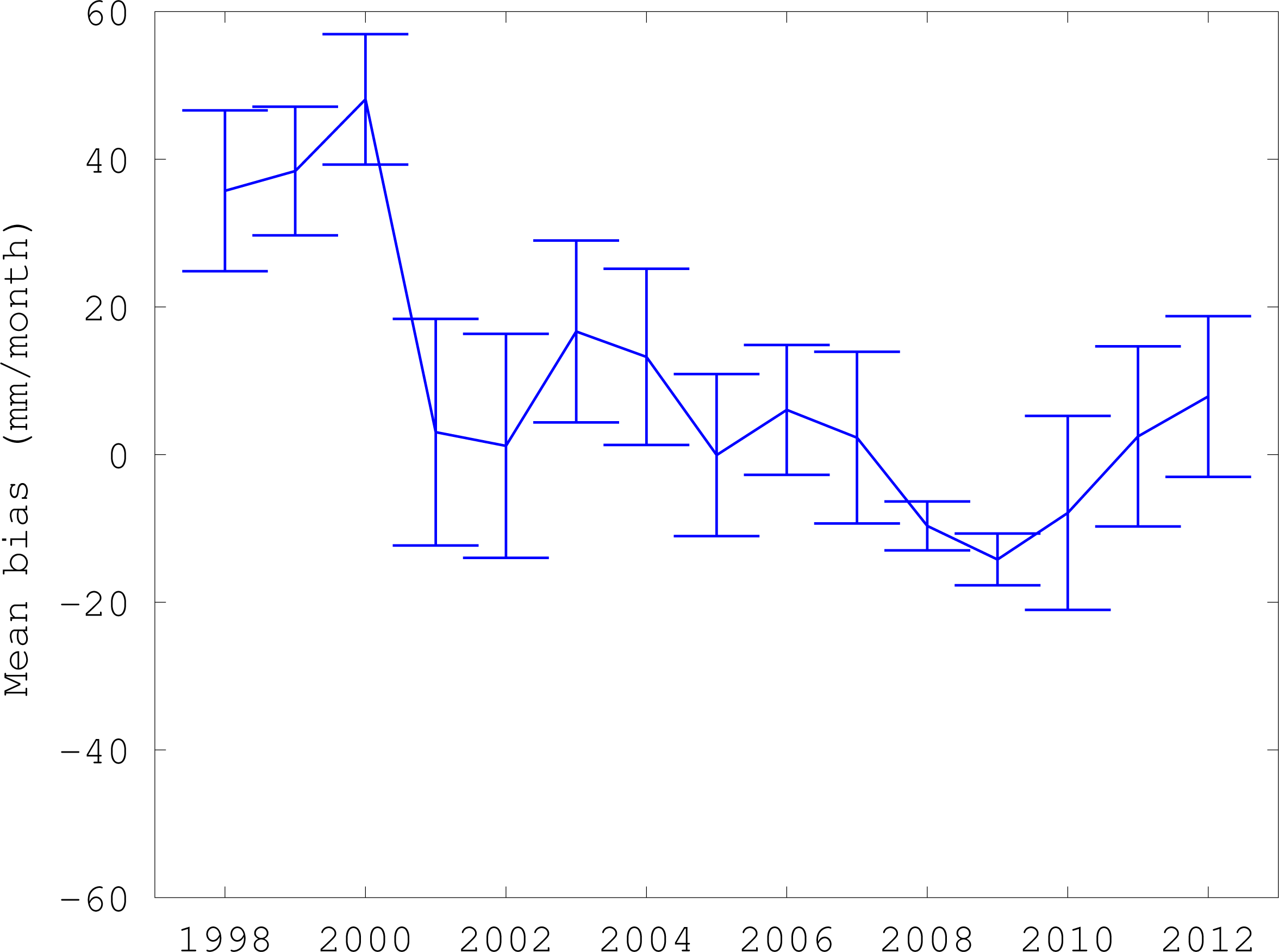 We also looked more closely at how the TRMM product, which was available and archived for a longer period (1998–2012) than any of the other satellite precipitation products evaluated, compares with station observations over time. Inspection of the differences between the product and station observations showed that the average bias in monthly precipitation (TRMM minus station) was −2.7 mm, not significantly different from zero (the standard error (SE) of the mean was 2.0 mm). Averaged over each calendar year, however, TRMM shows a substantial positive bias over the first years of the product (1998–2000, mean ± SE is +40.8 ± 5.5 mm/month) and a smaller generally negative bias over the other years (2001–2012, −8.6 ± 2.1 mm/month with no significant linear trend over the period) (Figure 3). Thus, it is possible that the decreasing trend in precipitation seen by TRMM may be due to product inhomogeneity, rather than to a real decrease in precipitation over Nepal in recent years. Still, the on average small bias in TRMM, especially for the more recent years, is better than any of the other satellite precipitation products considered (Table 1).