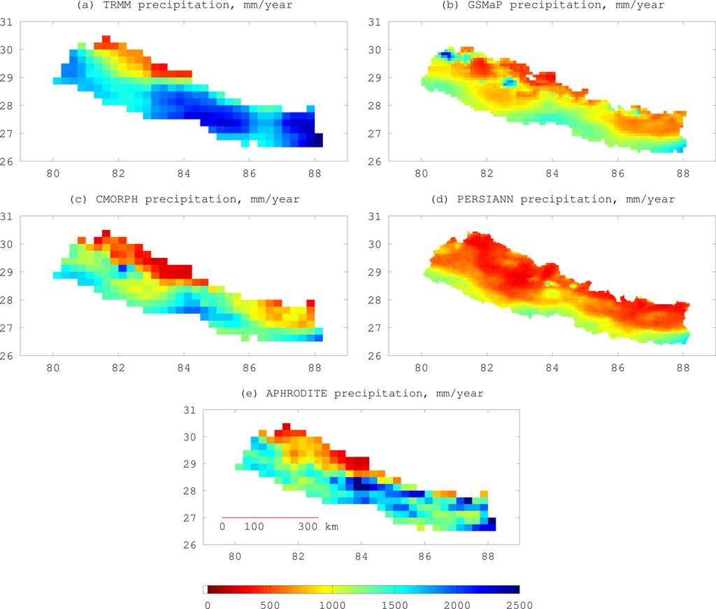 Mean precipitation (mm/year) over Nepal from (a) TRMM; (b) GSMaP; (c) CMORPH; (d) PERSIANN and (e) APHRODITE products. The color scale is the same for all panels. North is up; longitude (°E) and latitude (°N) are shown for reference.
