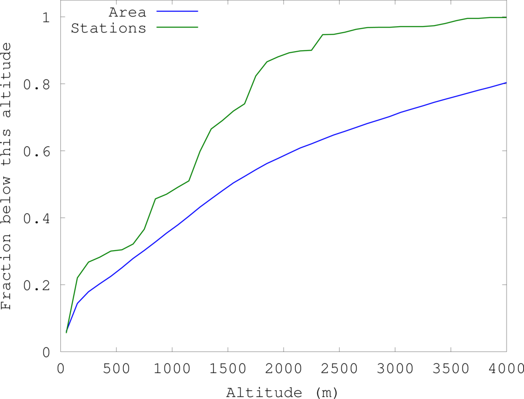 Figure 5 shows the altitude distribution in Nepal, compared to the distribution of available station measurements. Stations are fairly well distributed in altitudes up to about 2,400 m; however, only 5% of the precipitation data are from stations above 2,400 m, compared with 37% of Nepal’s area.