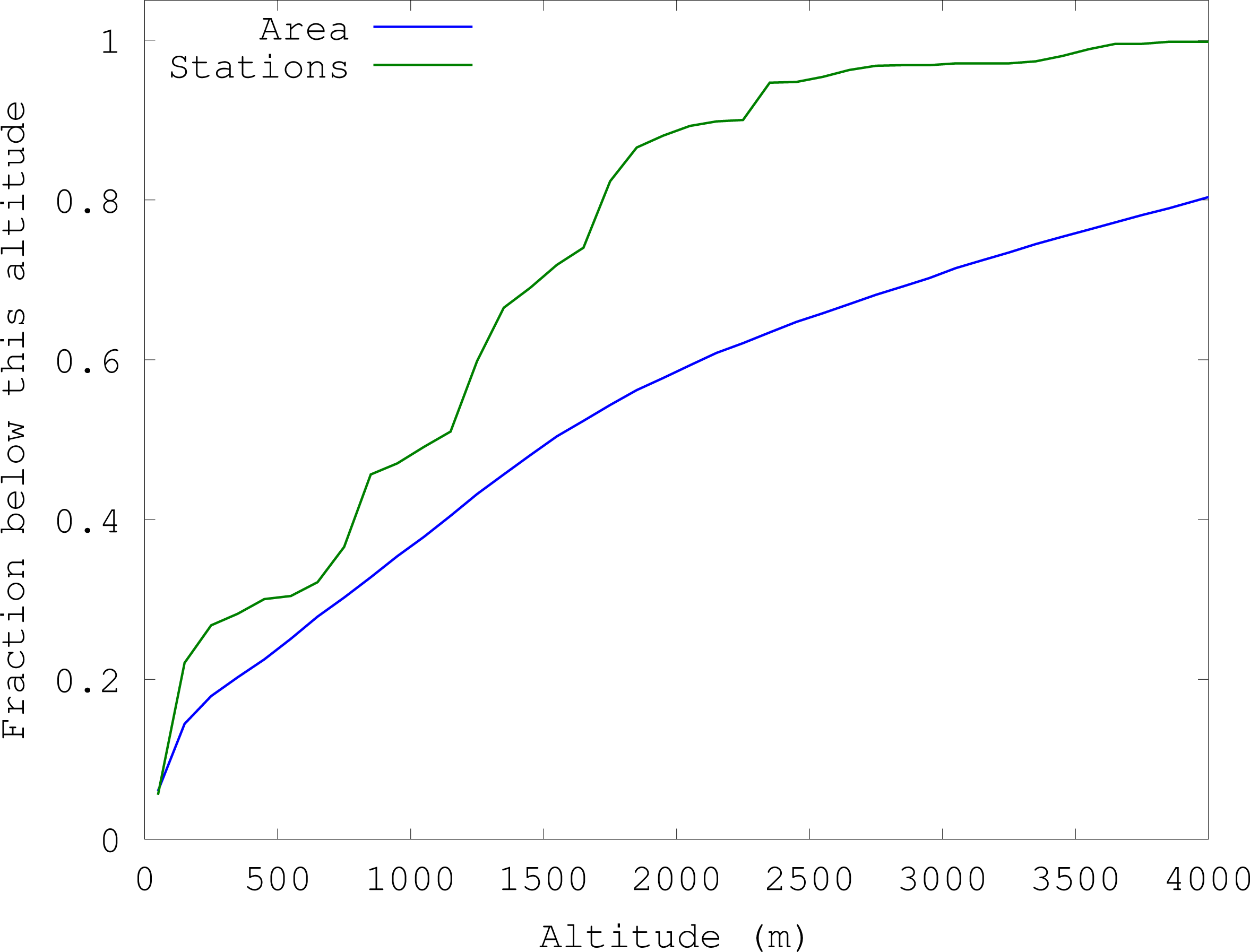 Distribution of Nepal’s area and of station precipitation measurements by altitude.
