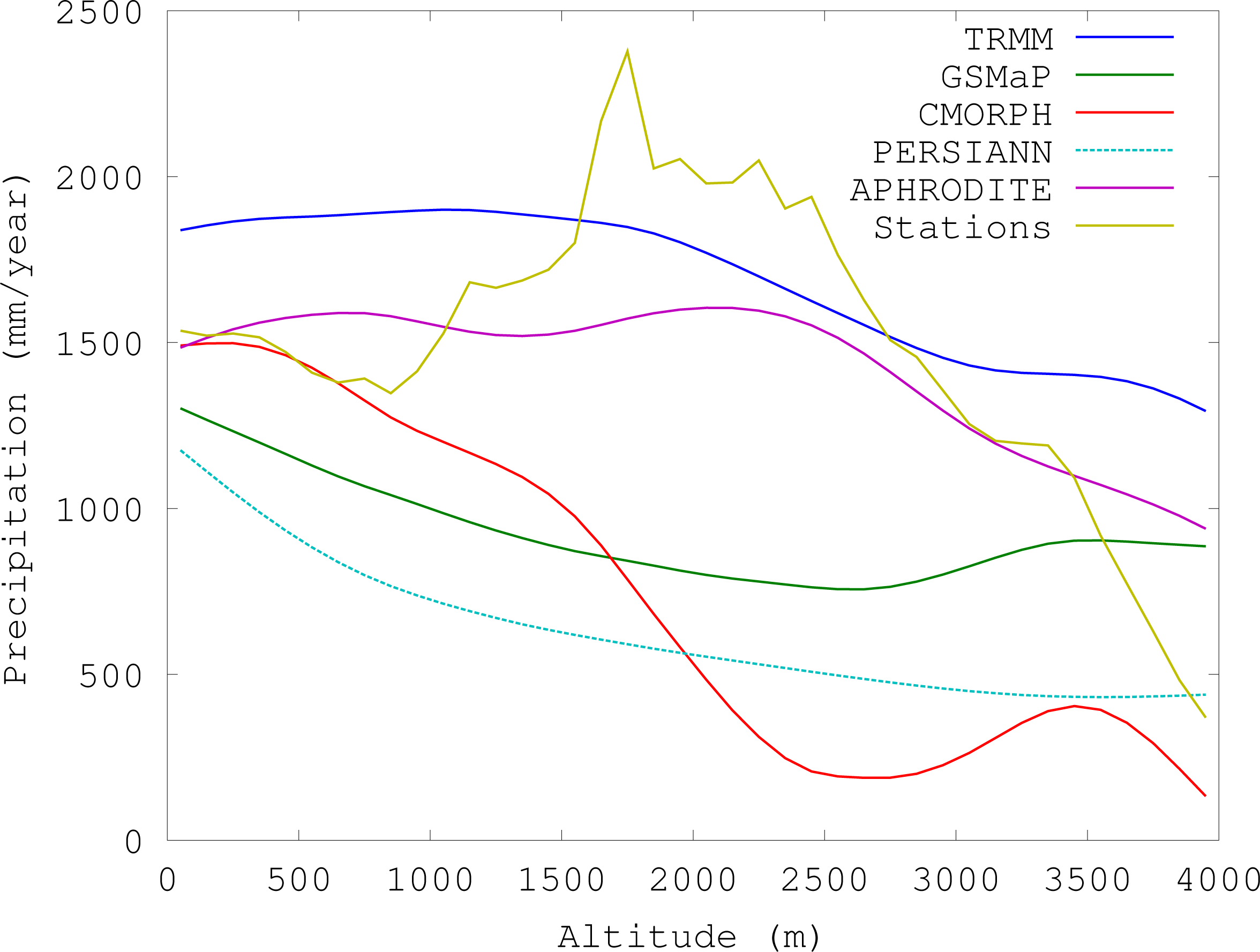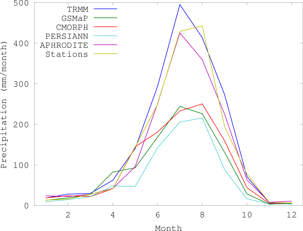 Figure 7 shows the mean seasonal cycle of precipitation over the lower altitudes where the stations are concentrated (below 2,400 m). All the products show a seasonality broadly consistent with the station observations. Interestingly, the observations, CMORPH and PERSIANN show peak precipitation in August, while TRMM, GSMaP and APHRODITE show it in July. Further investigation is required to understand the origin of this difference; since the different products span different time periods, interannual variability in the monsoon could be a factor.