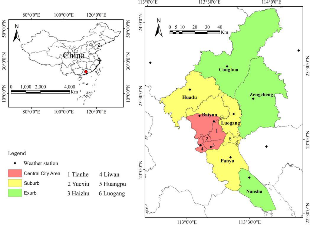 Greater Guangzhou (22°26′–23°56′N, 112°57′–114°03′E) is located on the northern edge of the Pearl River Delta in southern China [41] (Figure 1). Stretching across the Tropic of Cancer, Guangzhou belongs to a subtropical, marine monsoon climate with an annual average temperature of 21.4–21.9 °C. The annual precipitation is 1,612–1,909 mm, and concentrates between April and September [42]. These characteristics—warm and rainy with adequate light and heat—are beneficial to plant growth. Guangzhou’s population size has developed rapidly in recent years, and by the end of 2009, Guangzhou’s population size was more than 10 million with a rapid growth rate of 1.54% from 1990–2009. The economy of Guangzhou has also increased rapidly, with the regional GDP (current prices) growing from $31.96 billion in 1990 to $913.821 billion in 2009 [41]. According to Guangzhou’s overall planning (2010–2020) and Five-Year Plan (2011–2015), the city will be divided into three parts: the central area, the suburb and the exurb. The central area includes Liwan, Yuexiu, Haizhu, Tianhe, and Baiyun (south of Liuxihe and north second ring); the suburb includes Panyu, Luogang, Huadu, and Baiyun (outside of central area); and the exurb includes Conghua, Zengcheng, and Nansha.