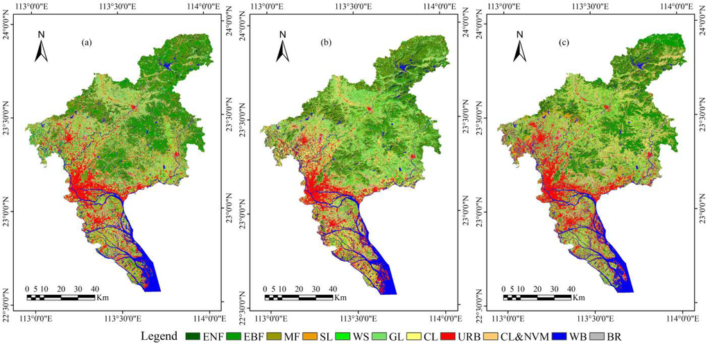 According to the actual land covers in Guangzhou, there are eight vegetation classes selected from the International Geosphere-Biosphere Program (IGBP) schemes in Table 1 [53]. In addition, the LULC types of “Urban and Built-up Lands”, “Water Bodies” and “Barren” are also identified with high accuracy.