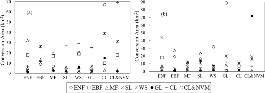 Conversion areas among land use/land covers during (a) 2001–2003, (b) 2003–2006.