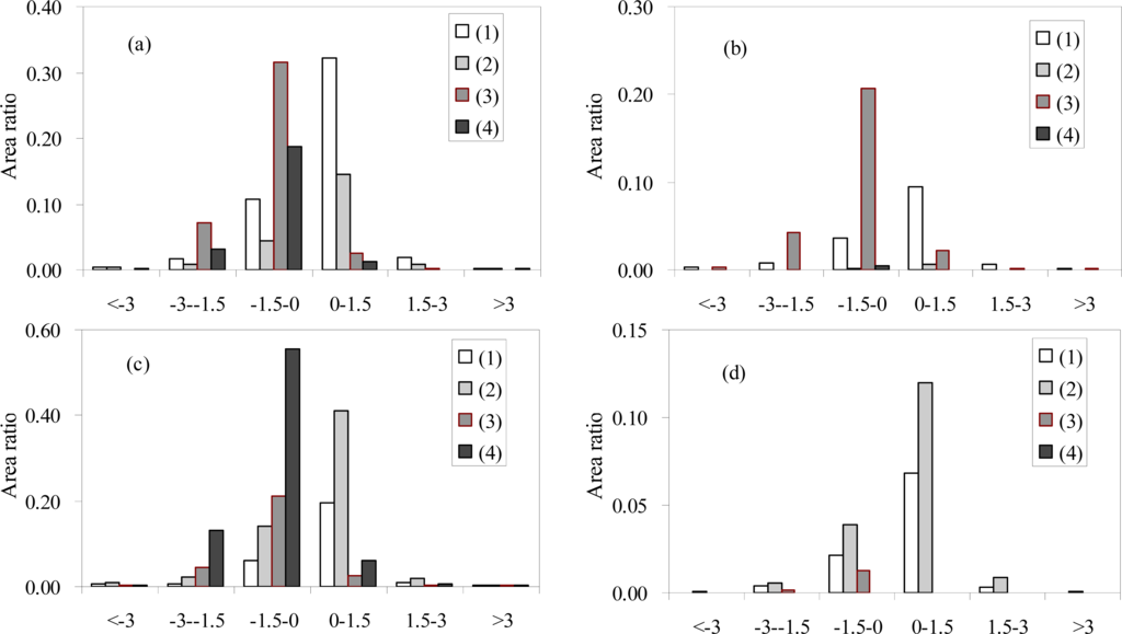 Statistical histogram of NPP dynamic index within the different scopes of effects. (a) 0%–25%. (b) 25%–40%. (c) 40%–85%. (d) 85%–100%. (1) 2001–2003 weather variation. (2) 2001–2003 LULC change. (3) 2003–2006 weather variation. (4) 2003–2006 LULC change.