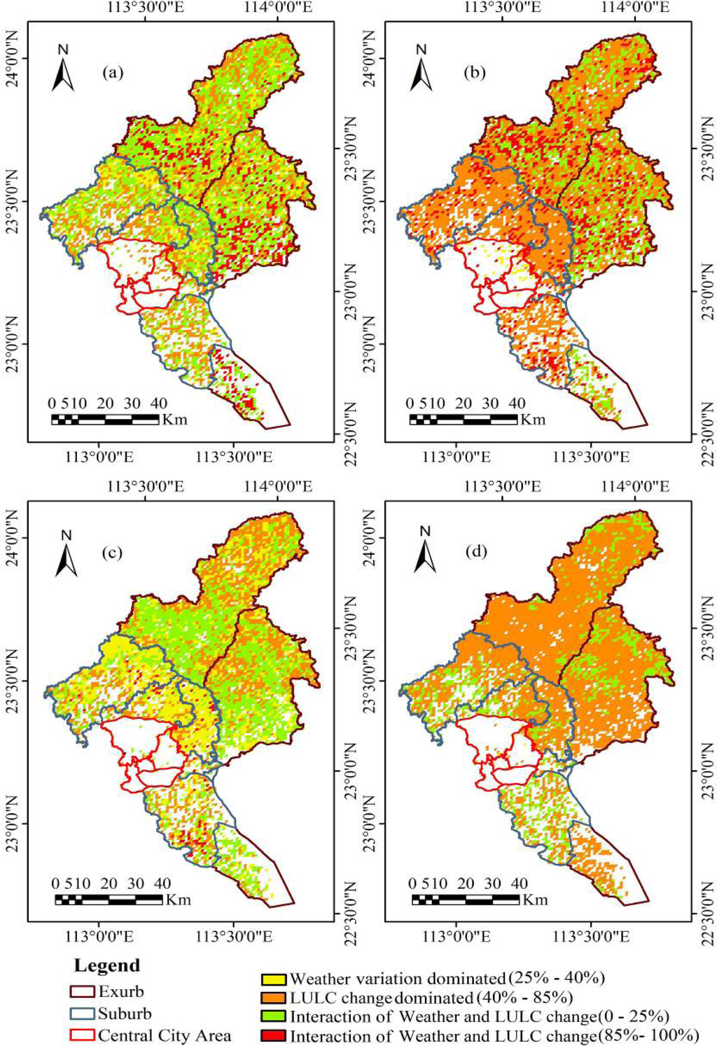 Spatial mapping of three effects patterns in the central area, suburb and exurb. (a) 2001–2003 weather variation. (b) 2001–2003 LULC change. (c) 2003–2006 weather variation. (d) 2003–2006 LULC change.